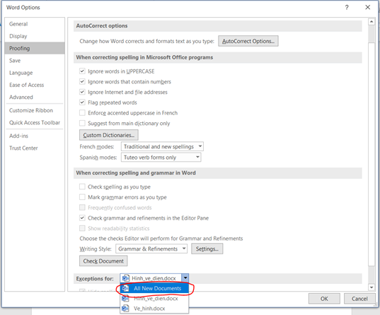 Cuộn xuống phía dưới cùng, tại danh sách thả xuống của Exceptons for, chọn All New Documets rồi OK: