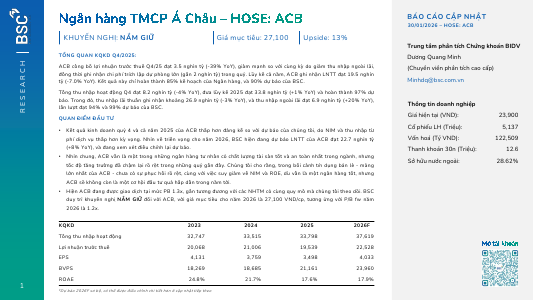 ACB: Khuyến nghị NẮM GIỮ với giá mục tiêu 27,100 đồng/cổ phiếuNguồn: BSC Tải về 30/01/2026 |