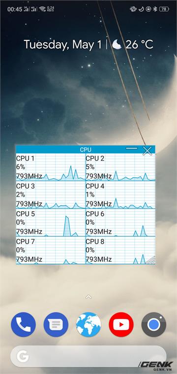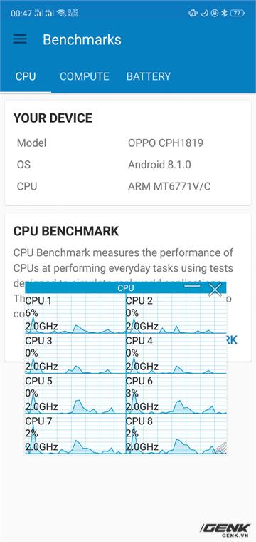 Biết rằng Helio P60 là một con chip cho hiệu năng CPU rất tốt, tuy nhiên việc nó có thể bỏ xa Snapdragon 660 nhiều như vậy lại là điều rất khó có thể xảy ra. Cách thức thực hiện: chúng tôi sử dụng phần mềm để theo dõi cách Oppo F7 sử dụng CPU khi chạy benchmark. Và kết quả không khiến chúng tôi ngạc nhiên. Oppo F7 sẽ theo dõi các tiến trình mà người dùng sử dụng, và một khi ứng dụng benchmark được khởi chạy, nó sẽ ép cả 8 nhân của Helio P60 chạy ở mức xung cao nhất là 2Ghz nhằm đạt được kết quả cao hơn. Điều này xảy ra ngay cả khi người dùng vào ứng dụng benchmark nhưng không chạy. Ngay khi thoát ra khỏi ứng dụng benchmark để trở về màn hình chính, mức xung sẽ từ từ giảm về mức 793Mhz.