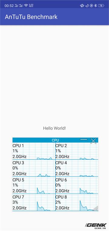 Chạy thử ứng dụng AnTuTu Benchmark giả trên Oppo F7 và chúng tôi thấy xung CPU vẫn được đẩy lên 2Ghz, mặc dù ứng dụng này không có một dòng code nào bên trong.