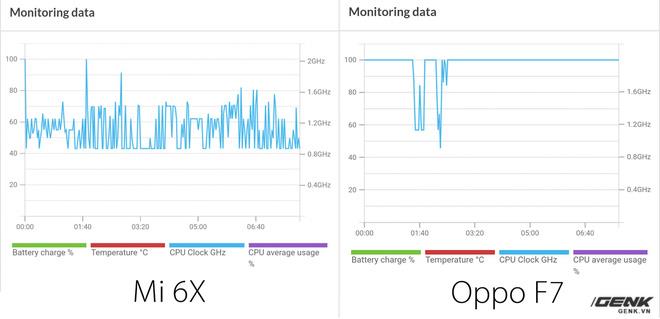 Như vậy, có thể việc Oppo F7 cho điểm số cao hơn những chiếc máy còn lại là do Oppo đã can thiệp vào quá trình benchmark, mà cụ thể ở đây là xung nhịp CPU. Khi so sánh với một chiếc máy khác không bị can thiệp như Xiaomi Mi 6X, có thể thấy rõ lợi thế của Oppo F7. Nếu như mức xung của Mi 6X chủ yếu dao động trong khoảng 1-1.5Ghz tùy vào độ nặng/nhẹ của tác vụ benchmark, thì F7 do luôn bị ép ở mức 2Ghz nên sẽ thực hiện nhanh hơn và đạt điểm số cao hơn.