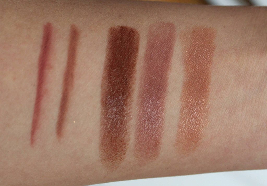 Swatches of the Smoky Eye Brick in Silk, Lid Lustre in Honey, and Satin Kajal Eyeliner