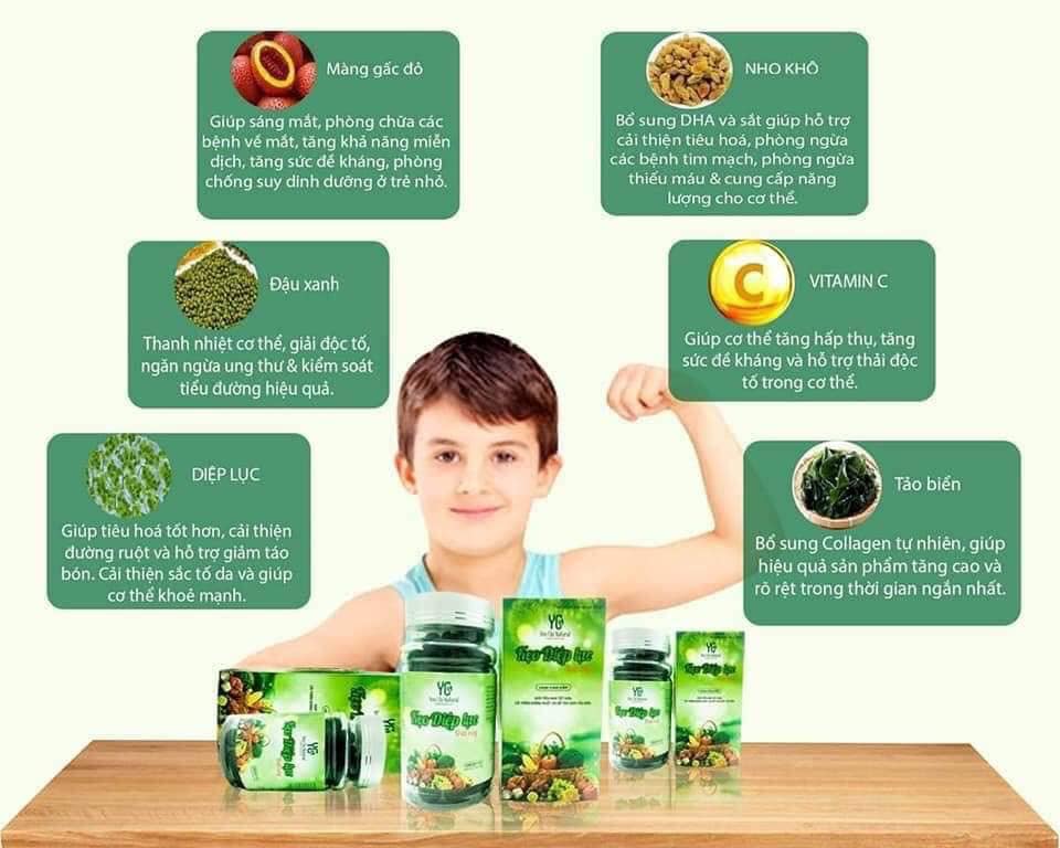 Diệp lục: Thanh lọc và làm sạch cơ thể, cải thiện sắc tố da. Chất diệp lục giúp giữ cân bằng canxi trong máu, đồng thời hỗ trợ gan trong việc loại bỏ các độc tố khỏi cơ thể đặc biệt tốt cho tiêu hoá. Cải thiện đường ruột và hỗ trợ giảm táo bón giúp cơ thể khoẻ mạnh.