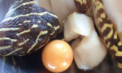 Zuo Zhang, ngư dân 48 tuổi ở Phúc Kiến, Trung Quốc, bắt được con ốc xà cừ nặng khoảng 1,5 kg khi kéo lưới vào hôm 3/3, theo Apple Daily. Zhang và vợ phát hiện một viên ngọc sáng bóng có đường kính hai cm trong lúc làm thịt ốc để chuẩn bị bữa trưa.
