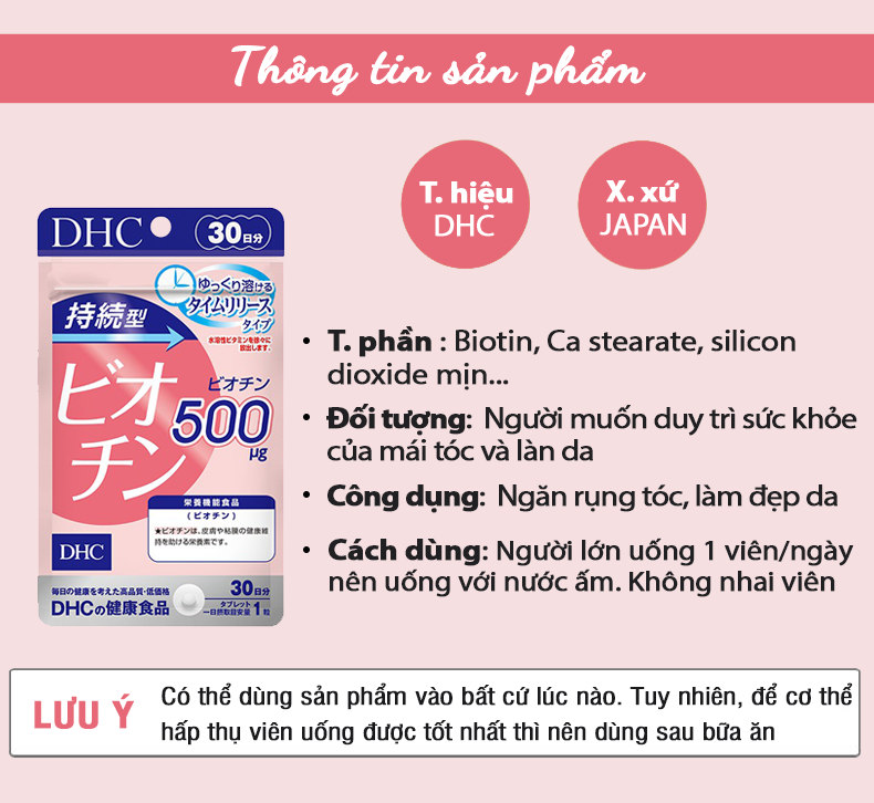 Thành phần viên uống biotin DHC: Đường bột (sản xuất tại Nhật Bản)/cellulose, hydroxypropyl methylcellulose, Ca stearate, silicon dioxide mịn, biotin