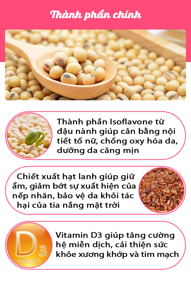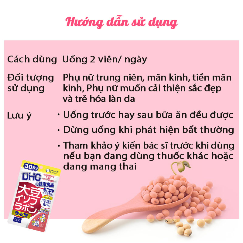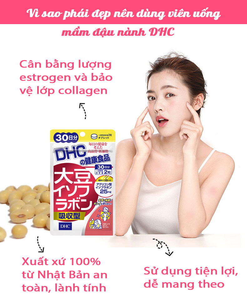CÔNG DỤNG- Viên uống mầm đậu nành DHC có tác dụng hỗ trợ bổ sung, cân bằng nội tiết tố nữ- Hạn chế lão hóa và giúp da khỏe đẹp, mịn màng- Hỗ trợ điều hòa kinh nguyệt, cải thiện các triệu chứng tiền mãn kinh: mất ngủ, mệt mỏi, rụng tóc- Duy trì vẻ đẹp thanh xuân, đẩy lùi dấu hiệu tuổi tác