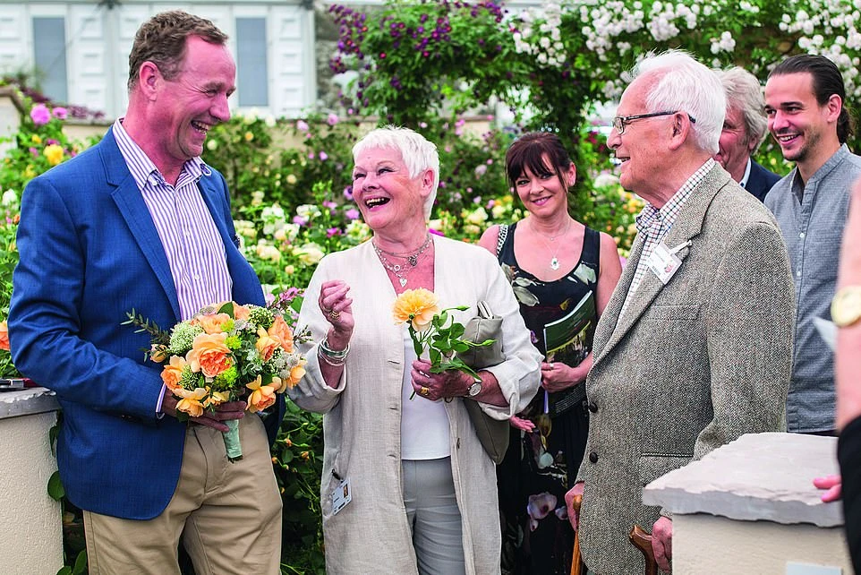 Ông David Austin (phải) và con trai ông là David Austin Jr (trái) nói chuyện với diễn viên nổi tiếng Judi Dench trong một lần bà đến thăm vườn hồng của ông. Ảnh: DAILY MAIL