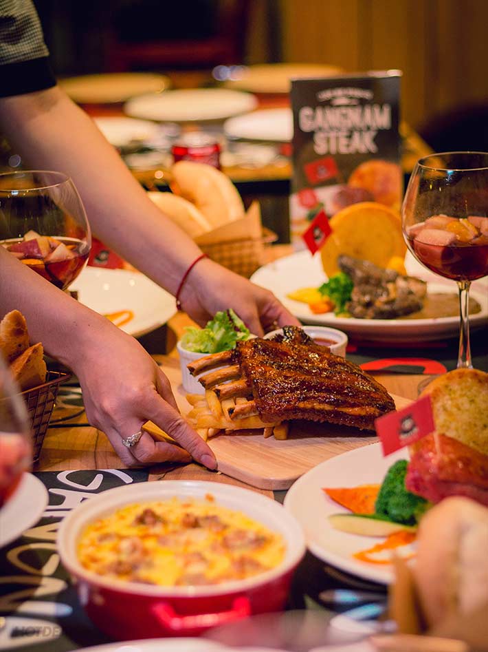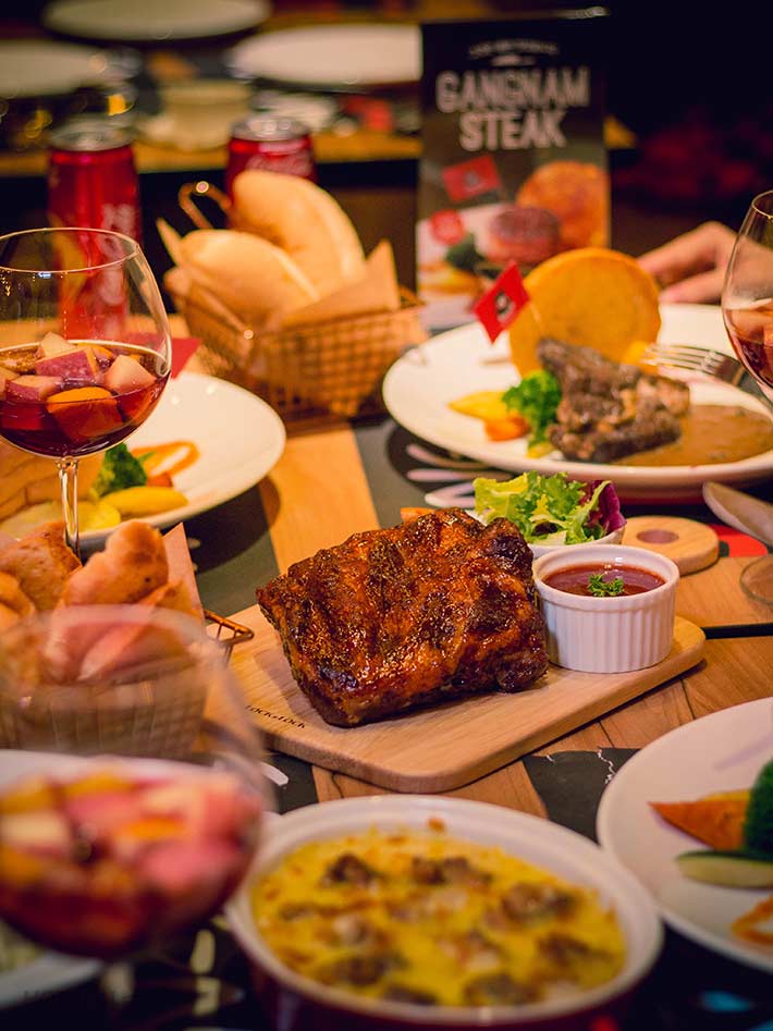 - Gangnam Steak mang đến cho khách hàng rất nhiều những món ăn chuẩn vị, ngon khó cưỡng như: bít-tết, mỳ Ý, bò hầm vang đỏ, pizza,...