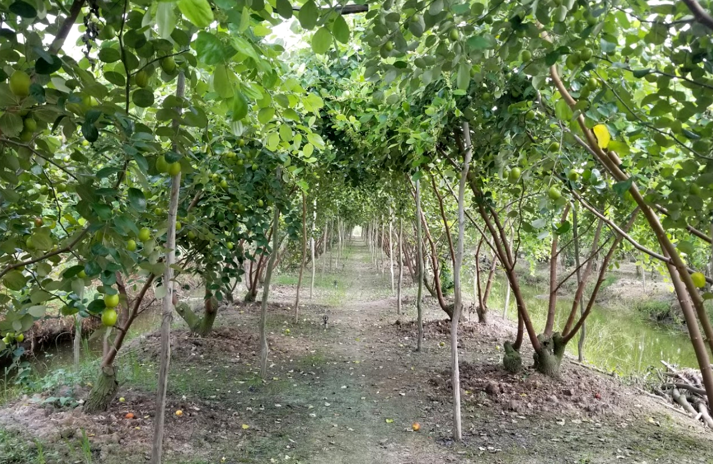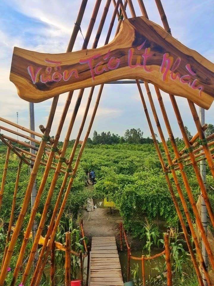 Du lịch Đồng Tháp, đến vườn táo Út Nhàn, bạn sẽ bước vào một không gian xanh mát bình yên. Những hàng táo được trồng thẳng tắp, xum xuê trái dọc theo những con kênh nhỏ nằm len lỏi trong vườn.