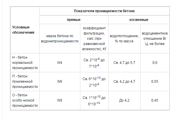 Độ thấm của hỗn hợp bê tông được thể hiện bằng các thông số gián tiếp và trực tiếp. Cái sau đề cập đến hệ số lọc và thương hiệu bê tông cho không thấm nước. Các chỉ số gián tiếp là một tỷ lệ chống thấm nước và hấp thụ nước. Theo cách này, có một bảng nhất định của bê tông không thấm nước: