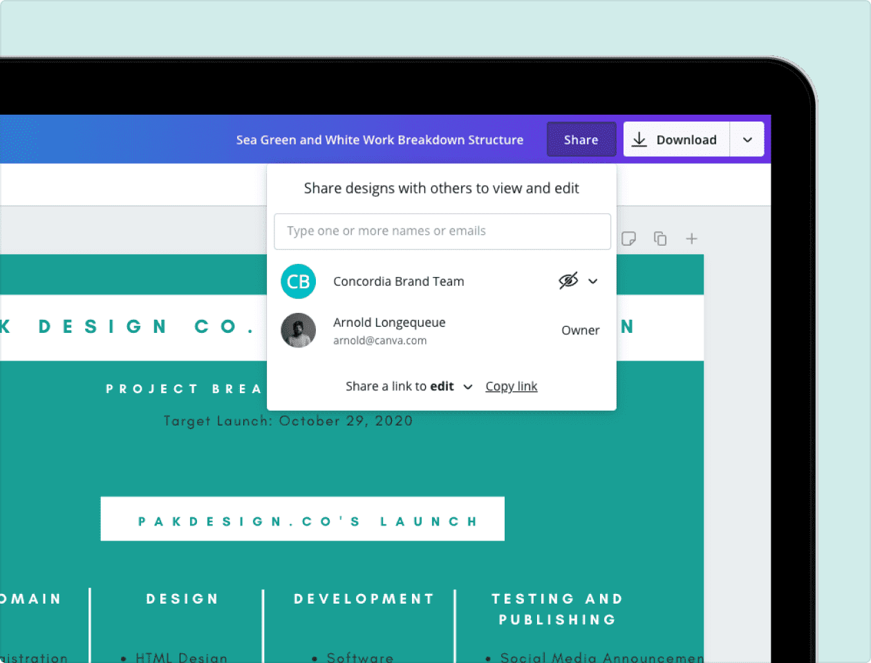 Việc tạo ra sơ đồ công việc chủ yếu là nỗ lực của cả nhóm và sẽ cần đầu vào cũng như quan điểm đóng góp của nhiều nhóm dự án và đơn vị khác nhau. Cung cấp cho nhóm quyền truy cập để chỉnh sửa hoặc xem thiết kế của bạn bằng cách nhấp vào nút chia sẻ trên thanh công cụ của trình chỉnh sửa rồi sao chép và gửi cho họ liên kết tới thiết kế của bạn. Vì Canva là một nền tảng hoạt động trực tuyến, nên tất cả những gì họ cần làm là đăng nhập vào tài khoản của riêng mình từ bất kỳ máy tính, iPhone, iPad hoặc thiết bị Android nào.