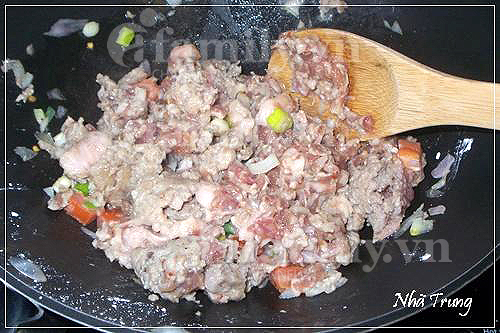 - Thịt heo xắt miếng dày, cho vào tô ướp cùng với nước tương, tỏi băm, hành hương, tiêu, muối, đường và xíu ớt bột để nghỉ khoảng 15-20 phút. Sau đó cho vào máy xay thức ăn xay nát (đừng xay mịn quá sẽ không ngon). - Thịt xay xong, cho ra tô. Cho hành trắng xắt nhỏ vào, trộn đều cùng với bột bắp.