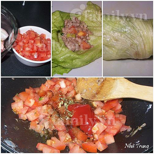 - Bắc chảo lên bếp, cho xíu dầu ăn vào tráng chảo. Chảo nóng, cho thịt vào xào chín, nêm gia vị vừa ăn. Cho thêm chút xíu cà chua xắt hột lựu vào (nếu thích). Xào đến khi thịt chín tới là được, cho ra tô. Dùng lại chảo đó để nấu xốt cà chua. - Xà lách cẩn thận tách từng lá một sao cho đừng bị rách (khoảng 7 lá) (có rách chút xíu cũng không sao). Rửa sạch, sau đó trụng sơ qua nước sôi để lá xà lách mềm và dễ cuộn mà không bị rách.Xốt cà chua: Cho xíu dầu ăn vào chảo, đổ chén cà chua vào cùng với ketchup (tương cà chua), hành lá, lá rau mùi khô, xíu muối, tiêu vào xào sơ qua là được.