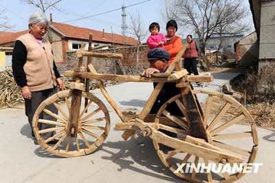 (Cadn.com.vn) - Ông Ngô Bồi Gia, 55 tuổi, làm nghề thợ mộc, ở làng Nam Trang, thị trấn Tôn Thụ, thành phố Thanh Đảo, tỉnh Sơn Đông (Trung Quốc), đã cặm cụi suốt 3 tháng qua và vừa chế tạo xong một chiếc xe đạp bằng gỗ. Toàn bộ các cấu kiện của xe đạp đều dùng gỗ làm ra, không có một bộ phận nào là bằng sắt thép, đến cả ở các mối nối cũng đều dùng chốt gỗ để cố định.