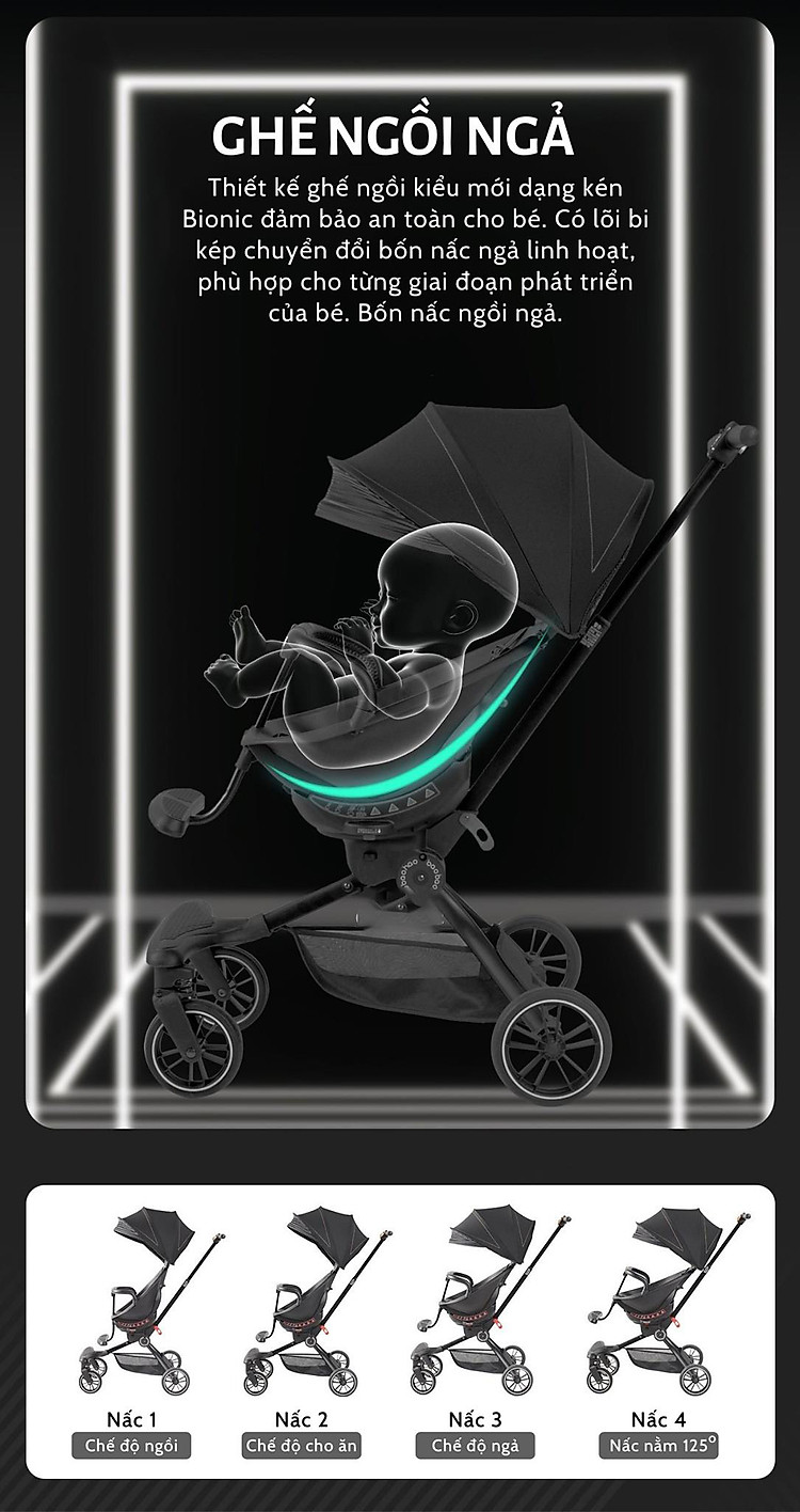 - Có tới 4 nấc điều chỉnh ngồi, ngả cho bé