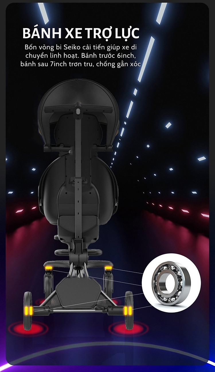 - Bánh xe lớn xoay 360 độ, linh hoạt, trơn tru, bám đường tốt, tăng cường và cải tiến 4 bạc đạn, giúp xe nhẹ nhàng.
