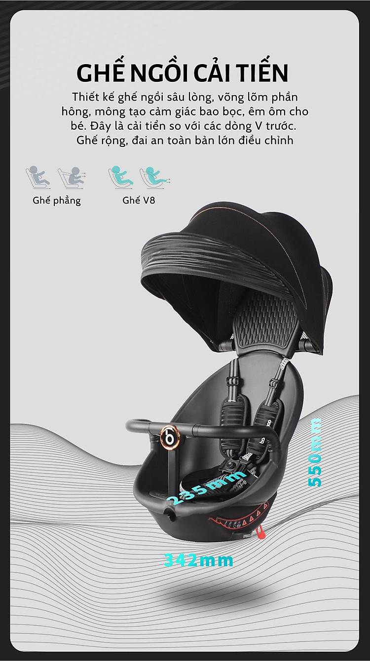 --> Có thể nói, V8 không đơn thuần là mẫu mới nhất mà nó còn là 1 siêu phẩm khi khắc phục được đầy đủ những nhược điểm mà những dòng xe thế hệ trước chưa làm được và tích hợp thêm các công nghệ mới để tạo ra một dòng xe đẩy du lịch hoàn hảo cho bé