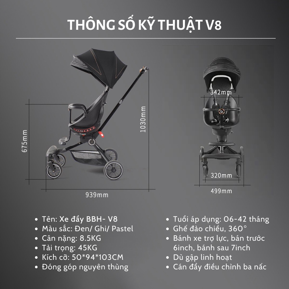- 2 tư thế BBH V8 gấp gọn có khung xe được làm từ hợp kim thép không gỉ.