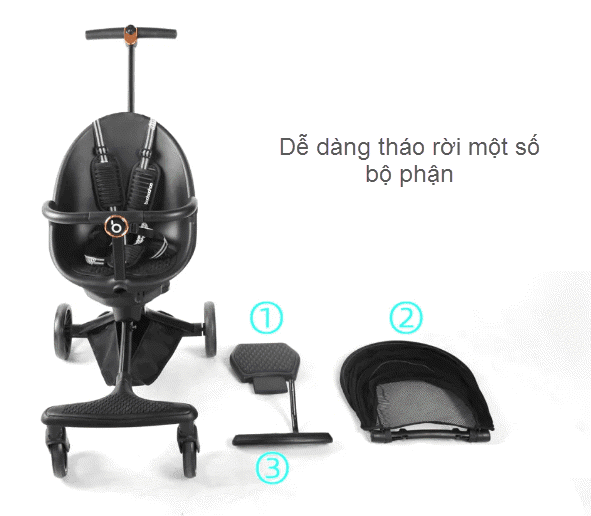 - Ghế ngồi rộng, có thể tháo rời, ghế xoay được 360 độ đổi chiều cho bé
