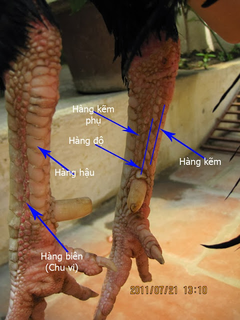 DANH XƯNG VÀ ĐẶC ĐIỂM CỦA VẢY GÀ: Vảy nhỏ ăn vảy lớn Ngũ quỹ ăn Tứ thánh, Tứ thánh ăn Tư tượng, Tư tượng ăn Tam tài. 1. Án Thiên: Tức một vảy lớn nằm sát đầu gối trên cao nhất.Nếu cách gối một hàng thì gọi là Án Thiên 2, cách một hàng nữa là Án Thiên 3. Gà có vảy này sức lực bền bỉ, tránh né tài tình, ra đòn thường chính xác. Rất Tốt. 2.Phủ địa: Có hình dáng giống như Án Thiên,nhưng được đặt dưới cựa,sát đầu bốn ngón chân. Gà có vảy này khi chinh chiến rất tinh nhanh, cựa địch khó lòng xuyên thấu. Tốt. 3.Khai Tiền: Một vảy thuộc hàng Thành nứt ra,bất luận trên hay dưới cựa đều không tốt. Gà này không nên dùng,vì thời vàng son đã tận. Rất Xấu. 4.Vấn Cán: Hình dáng như Án Thiên và Phủ Địa,nhưng được đặt ngoài nơi của Án Thiên và Phủ địa. Vảy này nếu trên cựa thì không tốt, nếu vấn 3 vảy sát đầu gối thì tốt, từ bốn vảy tuyệt đối không nên dùng. 5. Tứ Hoành Khai: Dưới gối có 4 vảy nhỏ, còn gọi là Đâu Đầu Nhịn Miệng< Xấu>. Sát gối có nhiều vảy nhỏ hoặc nằm từng chùm không khít nhau gọi là Nát Gối hoặc Ngũ Tu<5 vảy nhỏ>. Gà có vảy này kém tài,bở hơi,yếu sức ,hay bị mù mắt khi ra trận. 6.Dậm Chậu <Xấu> : Một vảy nhỏ nằm sát ngón trước< trước khi giáp ngón>. 7. Rọc Chậu: Vảy ở sát chân ngón bị cắt đứt< Xấu> 8. Ngậm Thẻ: Hai hàng vảy đều, bỗng nhiên có một vảy chen vào đường kẻ nhỏ,chia đôi ra. Gà này đá tứ tung,vô đòn vô thế. 9. Liên Giáp Ngoại: Hai vảy ở hàng Thành dính nhau thành một vảy lớn, gà này không tốt. Nhưng nếu từ hàng thứ 4 từ gối xuống có vảy này thì dùng được,gọi là Kích Biên. 10. Huyền Trâm: Còn gọi tên khác là Trung Huyền, là một vảy nhỏ nằm giữa hàng Thành và Quách, được đặt ngay và ngang với cựa. Vảy này có màu đen tuyền. Gà này đâm nhiều,chém dữ, thường đâm hỏng mắt đối thủ từ chân có vảy này. 11. Liên Giáp Nội: Hai vảy ở hàng Quách dính lại thành một vảy to. Nếu sát ngay cựa có hình giống miệng rồng gọi là Hàm Long, giống miệng cọp gọi là Hổ Khẩu. Nếu có hình tròn gọi là Nhật Thần. Gà có vảy này cựa đâm đòn độc, vào yếu huyệt của đối thủ. 12. Gạc Thập: Bốn vảy sát nhau, hai vảy hàng Thành,hai vảy hàng Quách , tạo nên ở giữa có hàng chữ thập, đặt ngang hàng với cựa. Gà có gạc thập chân đâm cựa liên hoàn,rất tốt. 13. Khai Vương: Bốn vảy dính nhau,tạo thành hình chữ Vương, gà tốt. 14. Ám Long : Còn gọi là Ẩn Long hoặc Vảy Yến., vảy này được đặt ngay ngón giữa,trước khi đụng ngón. Nếu vảy đó màu Hồng càng tốt,gọi là Ẩn Son. Gà này là "Linh Kê". 15. Khai Hậu: Một trong những vảy Hậu bị nứt ra,vỡ đôi. Gà này không tốt. Ngoại trừ mặt tiền có vảy Vấn Cán thì vẫn dùng được. 16. Trường Thành: hàng Thành lấn sâu vào hàng Quách, rất tốt. 17. Địa Giáp: Một vảy nhỏ mọc giữa lòng bàn chân,vảy này luôn chạm đất. Gà có vảy này là "Linh Kê". 18. Liên Châu: Vảy của ngón nội đi thẳng lên quá cựa, nó sẽ nhập vào đường thới . Nếu thẳng, no tròn từ trên xuống gọi là Liên Châu. Gà này có tài dùng cựa rất giỏi. (Chú ý khác liên chu: Nếu vảy điểm ngay cựa thì gọi là"liên chu" còn điểm ở ngón chúa thì gọi là "ác tinh" hay "ác hổ báo" gà này có tài đá hư mắt đối phương). 19. Nhân Tự: Hai hàng vảy nhập một tạo đường chỉ ra hình chữ Nhân, gọi là Giáp Long Nhân Tự, là gà rất quý. 20. Liên Móng : Những vảy trên ngón dính đôi hoặc ba,cho biết cái chân ấy mạnh. Khi đá,gà dùng ngón và móng nhiều ,hiểm lắm, gọi là Liên Móng hay Liên Tự Thừa Thiên,gà có nhiều đòn lạ. 21. Đại Giáp : Trên hàng Quách có 3 vảy dính lại tạo thành một vảy lớn,đóng gần cựa là tốt nhất. Gà này có nhiều thế, đâm đòn hiểm độc. Nếu Đại Giáp mà có mở miệng ngậm một vảy nhỏ gọi là Đại Giáp Ngữ Ngọc, gà này tài cao hiếm thấy, sử dụng cựa nhanh như tên bắn. 22. Trễ Giáp : Hai vảy ở hàng Quách song song sát nhau,cùng đuôi chỉ xuống vào cựa. Gà có Trễ Giáp ra đòn rất nhanh, hay tạt hay quăng, rất tốt. 23. Giáp Cần Hiếm lắm < Quý Kê> : Một vảy mọc trên cần cổ gà,được lông che kín, gà đứng nước cao, càng khuya càng trổ nhiều tài hiếm thấy. 24. Mai Cựa < Tốt> : Mặt trước,phía trong,tại hàng biên phụ sát cựa có 4,5 vảy dính chùm,hình tựa như hoa mai. Gà có hậu vận tốt. 25. Thập Đao <Tốt> : còn gọi là Thập Cựa, tại hàng biên phụ ,ngang với cựa có hình chữa thập nhỏ. 26. Ác Hổ Báo <Tốt> : Móng của ngón ngọ nổi lên môt chấm nhỏ màu Đen hoặc Xanh. Gà này có đòn ác độc, khó có địch thủ nào chịu nổi. 27. Xiên Đao <Tốt> : Hình dáng như vấn cán,nhưng ở đầu hàng Thành cao,đầu hàng Quách thấp hơn, chĩa xéo xiên vào cựa. Nếu hàng Quách có 1 vảy nhỏ,dài,chỉ vào cựa,cũng gọi là Xiên Đao. 28. Hàm Rập <Tốt> : Hàng Thành và hàng Quách vòng cung lên theo chiều ngang. 29. Thư Hùng Kê <Quý> : Gà có đôi chân Nhật Nguyệt, một chân trắng một