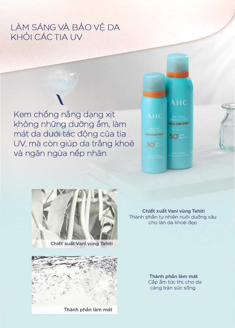 Xịt chống nắng theo phong cách Hàn Quốc với khả năng chống UV giúp ngăn chặn hư tổn cho da và lão hóa sớm, được tạo nên bởi những chuyên gia chăm sóc da hàng đầu Hàn Quốc của AHC. Xịt chống nắng AHC Natural Perfection Aqua kết hợp những ưu điểm của loại xịt khoáng hiệu quả cùng khả năng chống UV mạnh mẽ.