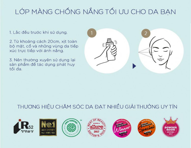 Công thức với một loạt các bộ lọc UV mạnh mẽ, giúp chống lão hóa và tia UV lâu dài để giúp ngăn ngừa tổn thương da.Axit hyaluronic với trọng lượng thấp và các thành phần nhẹ nhàng tự nhiên sẽ chăm sóc da bên cạnh việc bảo vệ khỏi kích thích bởi tia UV từ mặt trời.Hướng dẫn sử dụng: Giữ chai khoảng 30cm so với mặt và xịt đều. Lưu ý nhắm mắt, buộc tóc và mặt phải sạch và khô. Khi tiếp xúc trực tiếp với ánh sáng mặt trời trong thời gian dài, hãy sử dụng thường xuyên trong ngày.