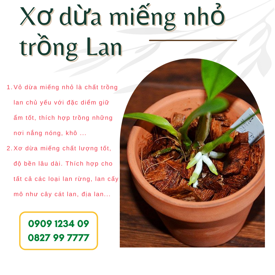 Xơ dừa miếng nhỏ đã qua xử lý loại bỏ các mầm nấm, bệnh. Dùng làm giá thể trực tiếp hoặc có thể trộn lẫn với các loại giá thể khác như vỏ thông, than củi để trồng lan. Giữ ẩm tốt. Trong xơ dừa chứa nhiều chất dinh dưỡng giúp kích thích bộ rễ phát triển nhanh và mạnh hơn.
