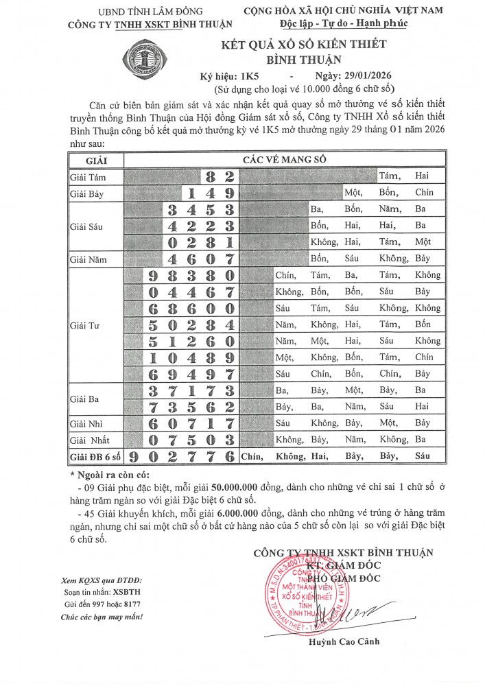 - Kết quả mở thưởng vé số Bình Thuận ngày 22/01/2026, ký hiệu 1K4: + Khách hàng tại Tỉnh Long An đã trúng giải đặc biệt, tổng giá trị giải thưởng: 28 tỷ đồng. + Khách hàng tại Tỉnh Long An giải phụ đặc biệt, tổng giá trị giải thưởng: 6,3 tỷ đồng. + Khách hàng tại Tỉnh Vĩnh Long đã trúng giải nhất, tổng giá trị giải thưởng: 4,2 tỷ đồng.