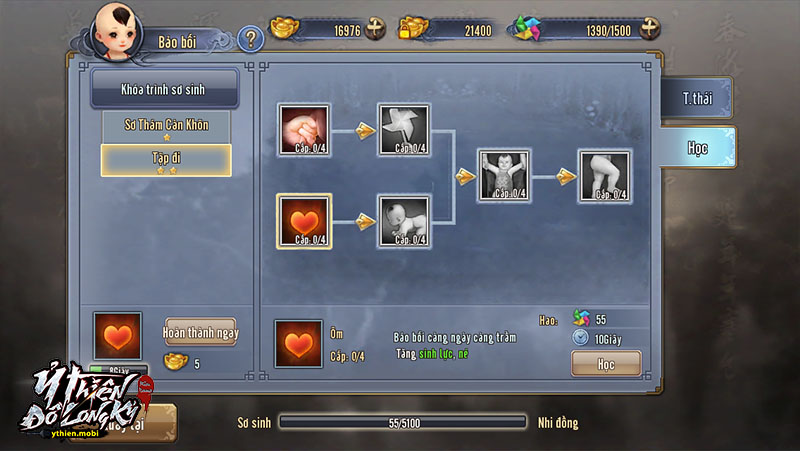 Sau khi sinh hoặc nhận nuôi, phụ mẫu có thể thông qua giao diện “Bảo bảo” để tiến hành bồi dưỡng, dần dần nâng cao năng lực của con mình. Sẽ có những giai đoạn cụ thể như sơ sinh, nhi đồng hay thậm chí là trưởng thành mà người chơi cần bồi dưỡng để phát triển cho bảo bảo của mình bao gồm các thuộc tính cơ bản như nội công, sinh lực, ngoại thủ, chính xác, bạo kích, né,…