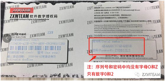 5.打开ZXWTEAM软件数字授权码,从右侧撕开内页会有授权码序列号和密码。