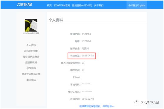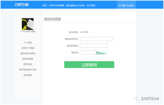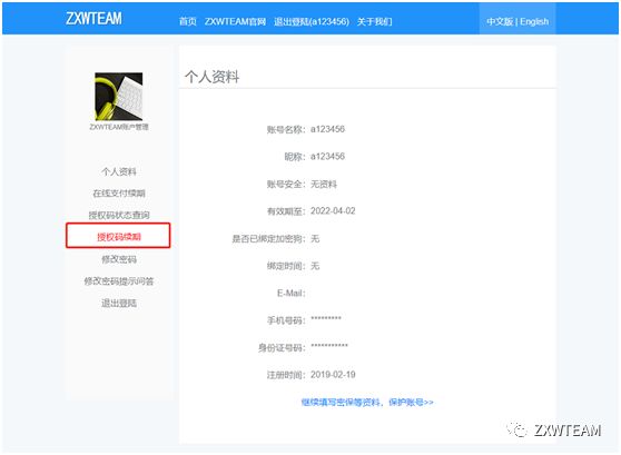 已经登录ZXWSoft软件的用户可以点击左侧菜单栏 账户管理 进入个人资料页面进行授权码续期。